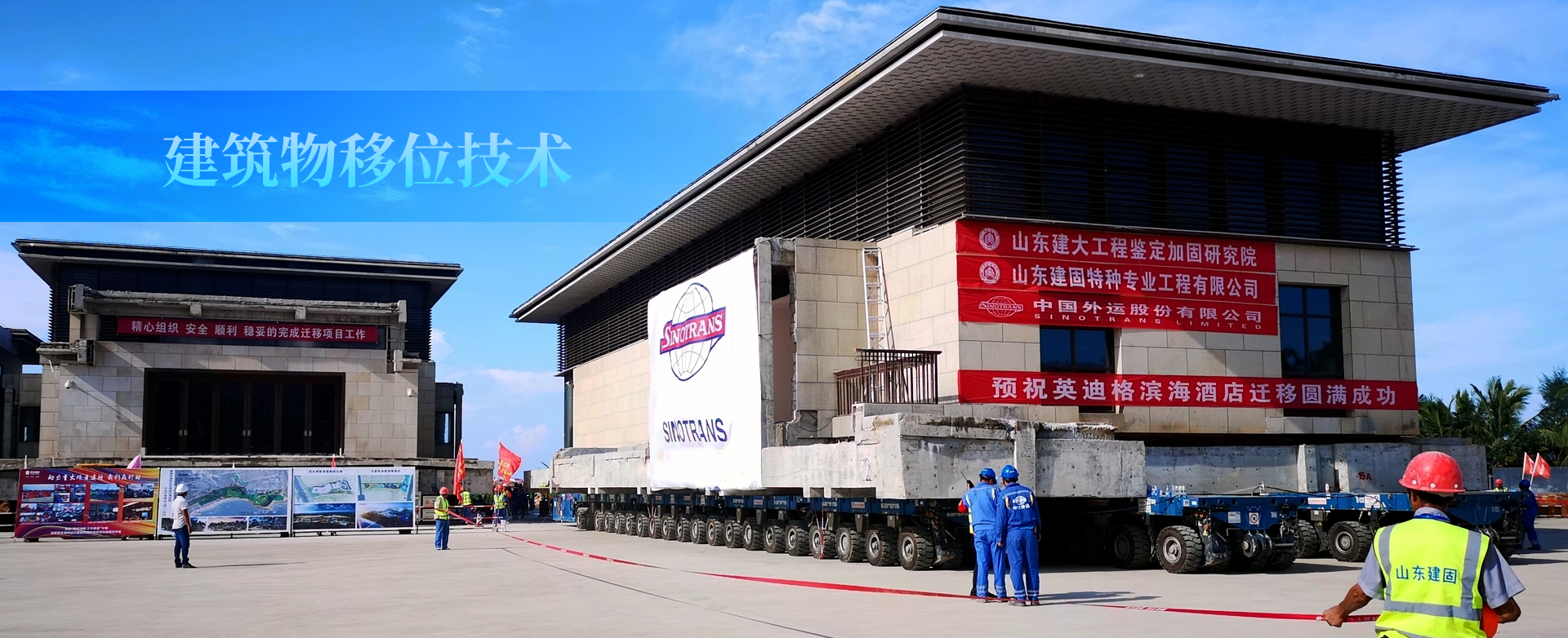 海南紅塘灣酒店為地下1層、地上2層鋼筋混凝土框架結構。占地面積約2400㎡,總建筑面積4658㎡。遷移直線距離約500米,豎向頂升2.3米。紅塘灣酒店遷移工程的成功就位,標志著一個新的記錄誕生:目前國內外首例不規則扇形車輛布置、國內拖車移位單體建筑面積最大(4658㎡)、國內拖車移位單體建筑重量最重(7500噸)。山東建筑大學工程鑒定加固研究院、山東建固特種專業工程有限公司成立于1992年,三十年一直秉承“篤志疑難躬行求新”的企業精神,完成建筑物鑒定與加固改造、建筑移位、建筑糾傾項目六萬余項。山東萊蕪高新區辦公樓平移項目,建筑面積24000㎡,重量35000噸,是國內外最重平移工程;主持完成的